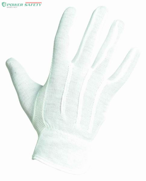 • Kötött pamutkelméből varrt, mandzsetta nélküli kesztyű PVC-vel pontozott tenyérrel és ujjakkal, valamint rugalmas szalaggal a csukló felső részén.