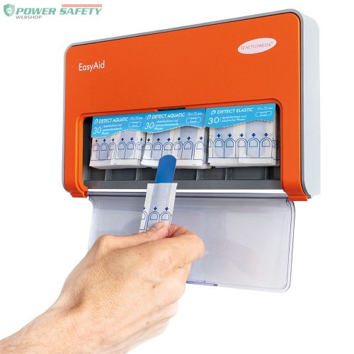 Egykezes sebtapasz adagoló, melyben akár háromféle sebtapasz is elfér. Az újratöltés szükségét az intelligens Kanban rendszer jelzi. Higiénikus kivétel a lefelé nyíló nyíláson keresztül. Opcionálisan lopás ellen zárható. A zárt ház még kihívásokkal teli környezetben is védi a tartalmat az elkoszolódástól. Könnyen felismerhető a narancssárga jelzőszín miatt. Felszerelési anyagot és használati utasítást is tartalmaz. 2x 30 db DETECT AQUATIC, és 1x 30 db DETECT ELASTIC sebtapasszal. Sebtapaszok mérete: 19 x 72 mm.