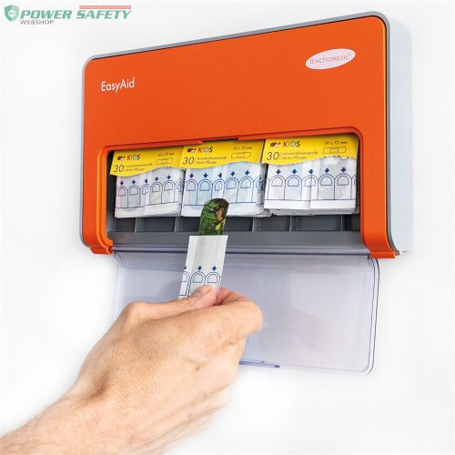 Egykezes sebtapasz adagoló, melyben akár háromféle sebtapasz is elfér. Az újratöltés szükségét az intelligens Kanban rendszer jelzi. Higiénikus kivétel a lefelé nyíló nyíláson keresztül. Opcionálisan lopás ellen zárható. A zárt ház még kihívásokkal teli környezetben is védi a tartalmat az elkoszolódástól. Könnyen felismerhető a narancssárga jelzőszín miatt. Vízlepergető sebtapaszokat tartalmaz színes dzsungelmintával. Felszerelési anyagot és használati utasítást is tartalmaz. 3x 30 db KIDS sebtapasszal. Sebtapaszok mérete: 19 x 72 mm.