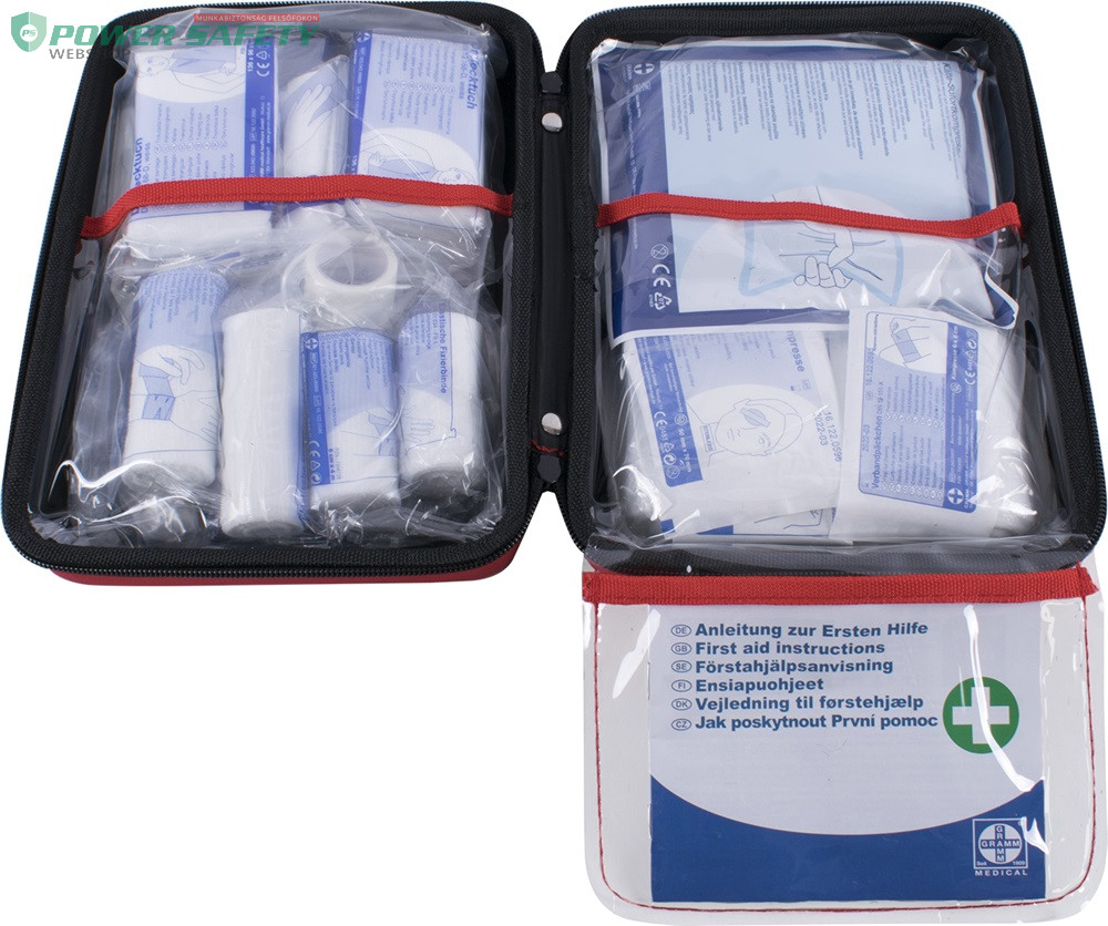Erős, tartós és könnyű elsősegély táska, helytakarékos formában, hordozófogantyúval, körbefutó cipzárral és átlátszó belső elválasztóval az optimális hozzáférés és az azonnali áttekinthetőség érdekében, DIN 13 157 szerinti GRAMM minőségű tartalommal, minden termék több nyelven felcímkézve és illusztrációkkal ellátva a könnyű használat érdekében.