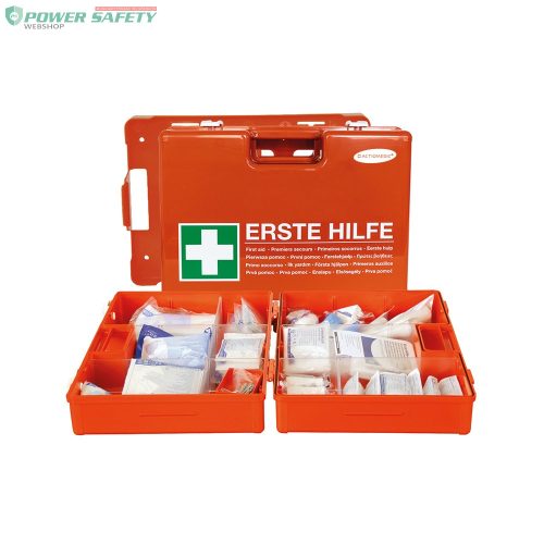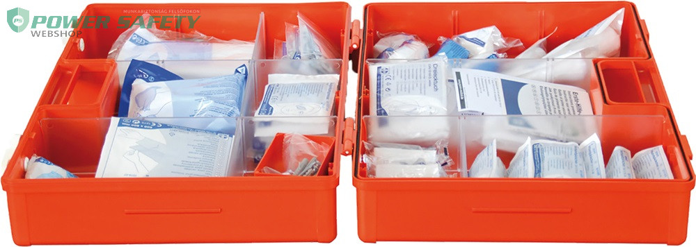 Ütés- és törésálló elsősegély doboz ABS műanyagból, DIN 13 169 szerinti tartalommal, gumitömítéssel, 90°-os ütközővel ellátott fali tartóval, állítható belső felosztással, mobil és helyhez kötött használatra, lepecsételhető zárral.