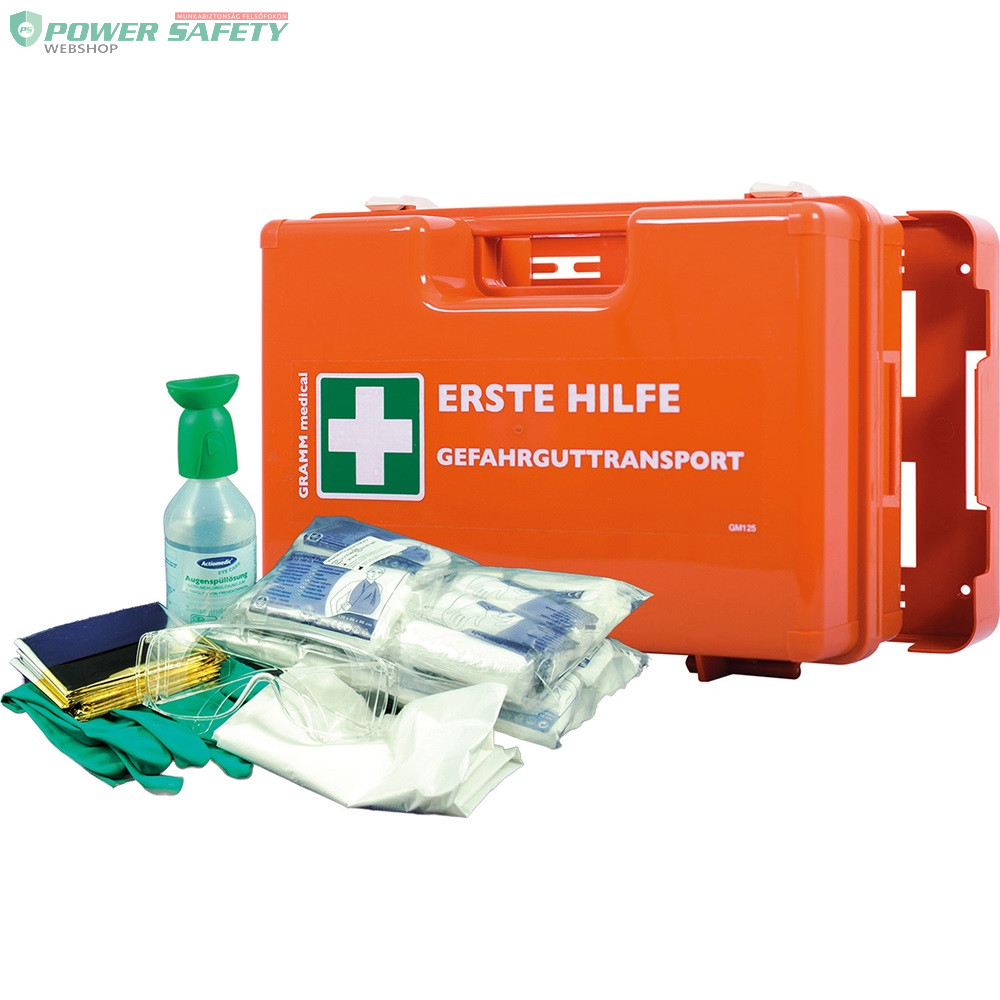 Ütés- és törésálló elsősegély doboz ABS műanyagból, állítható belső felosztással, mobil és helyhez kötött használatra, fali tartóval és gumitömítéssel, lepecsételhető zárral. Tartalom: DIN 13 164 szerinti tartalom, 1 mentőtakaró, 1 pár védőszemüveg, 1 pár saválló kesztyű, 1 szemkimosó oldat, 2 eldobható kötény.