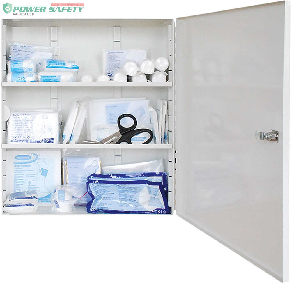 Egyajtós elsősegély szekrény robusztus acéllemezből, DIN 13 169 szerinti tartalommal, fehér színű zománcozott festéssel és elsősegély szimbólummal, két állítható polccal, két kulccsal rendelkező biztonsági zárral.