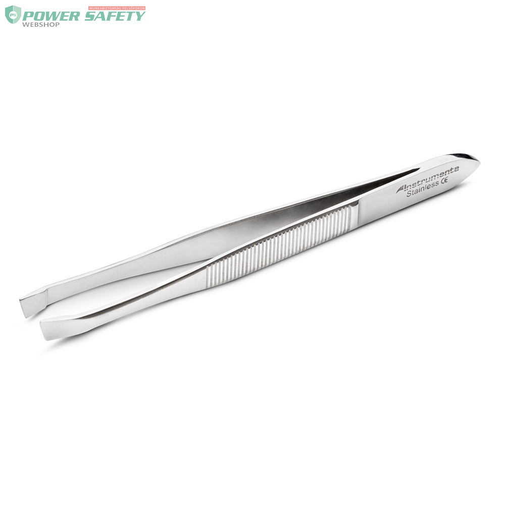 Rozsdamentes acél csipesz, egyenként műanyag tasakba csomagolva. Kifejezetten elsősegélynyújtáshoz tervezve, kiválóan alkalmas kötszerek kezeléséhez vagy idegen tárgyak eltávolításához a sebekből. Méret: 100 mm.