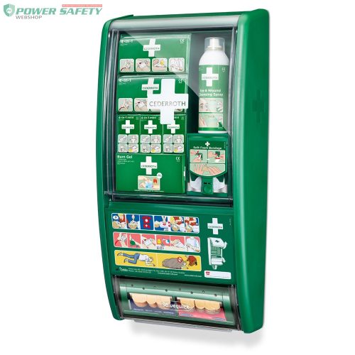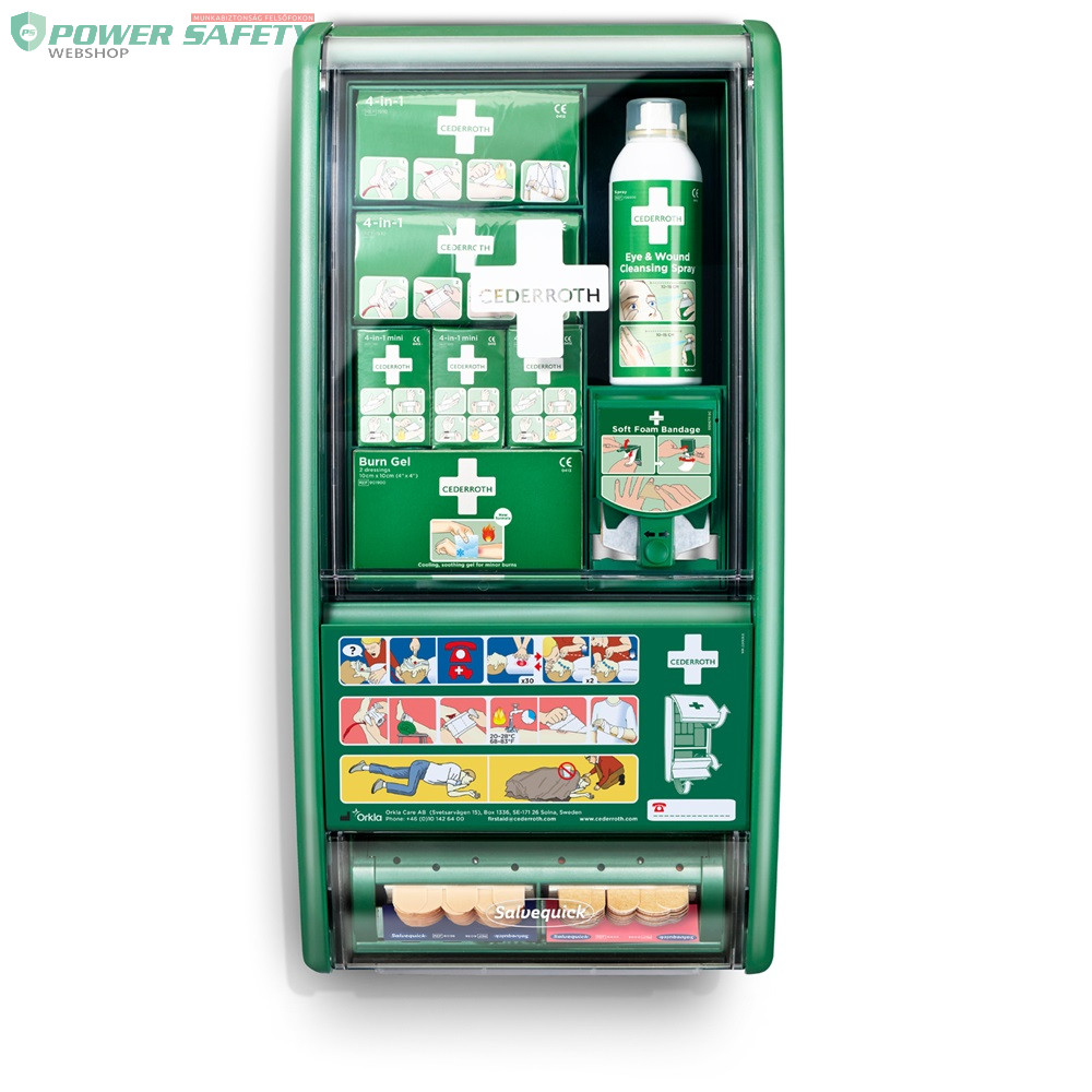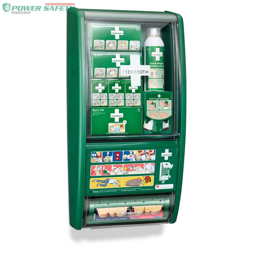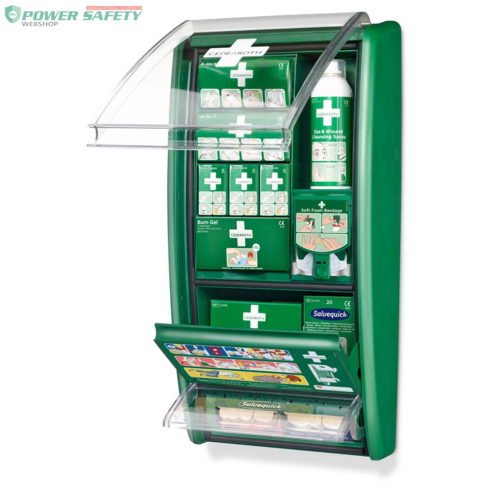 Teljesen felszerelt elsősegély-állomás, amely mindenféle sérüléstípus ellátására alkalmas, sokféle ellátási lehetőséget kínálva és könnyen hozzáigazítható a különböző munkahelyi igényekhez. Minden termék könnyen hozzáférhető, és átlátszó fedél védi a portól és a nedvességtől. Az elsősegélynyújtási utasításokkal ellátott fedél mögött további termékek számára is biztosított a hely. Beépített téphető/vágható ragtapasz-adagolóval, amely segítségével könnyedén levághatja a megfelelő mennyiséget. A ragtapasz mindenféle kisebb sebre használható, és vízben is a helyén marad. Zárható, az utántöltéshez speciális kulcsra van szükség. Minden termék CE-jelöléssel ellátva.