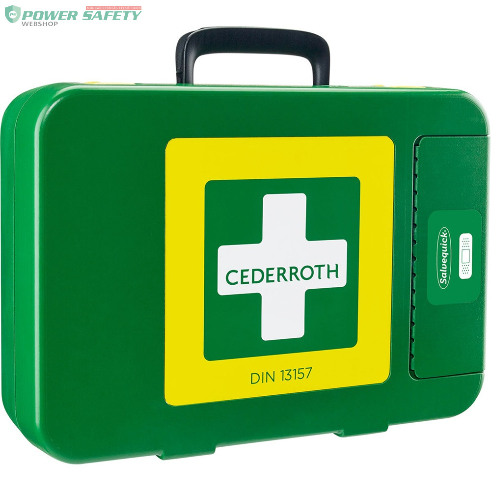 DIN 13 157 szerinti tartalommal ellátott nagy elsősegély doboz vastag és tartós műanyagból, amely védi a csomag tartalmát a portól és a nedvességtől. Állítható, kényelmes fogantyúval rendelkezik, így könnyen rögzíthető vagy hordozható. A doboz külső oldalán található a Salvequick sebtapasz adagoló, melyből egyszerűen és gyorsan eltávolíthatja a sebtapaszt, anélkül, hogy hozzáérne a készletben lévő többi termékhez, így biztosítva, hogy azok higiénikusan tiszták maradjanak. Belül átlátszó műanyag zsebek, amelyben minden termék jól látható és könnyen hozzáférhető, amikor minden másodperc számít. Hely a saját kiegészítők számára is. Az élénkzöld és sárga színű készlet már messziről jól látható. Minden termékhez világos, önmagyarázó használati utasítás tartozik. Minden termék CE-jelöléssel ellátva.