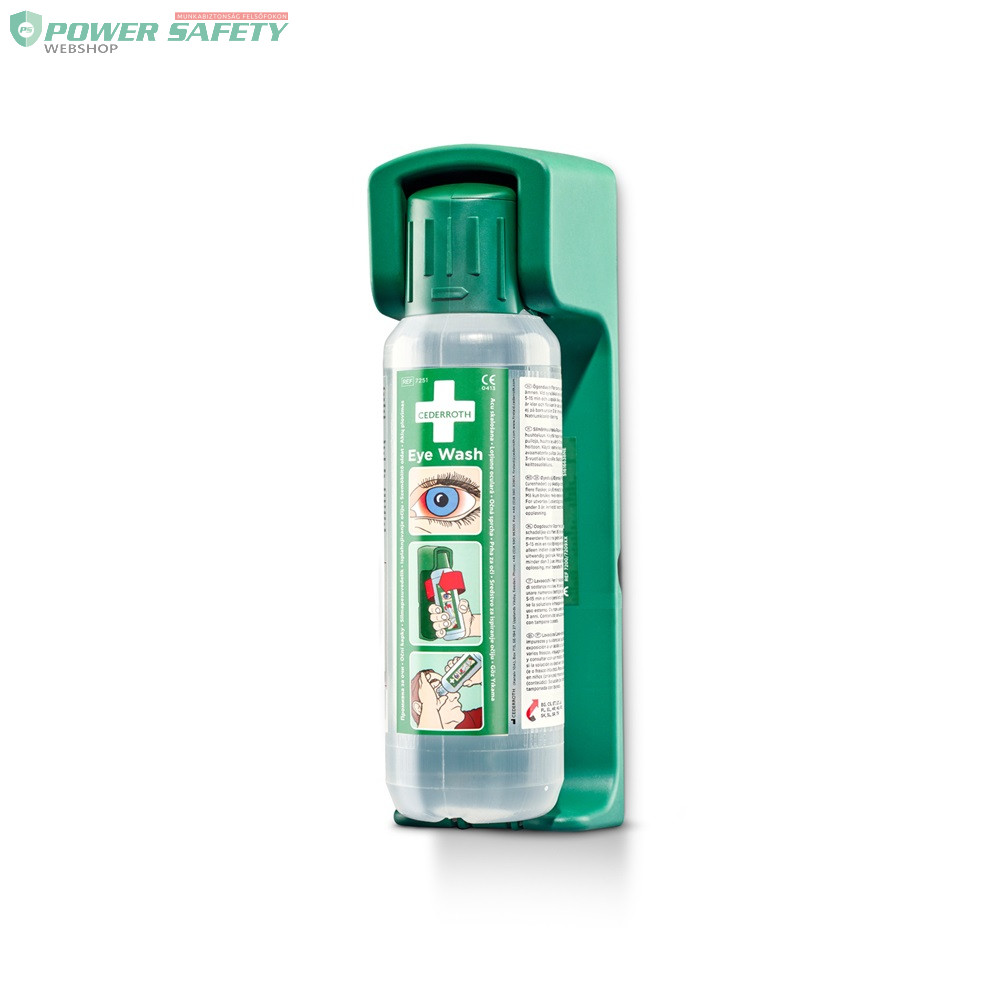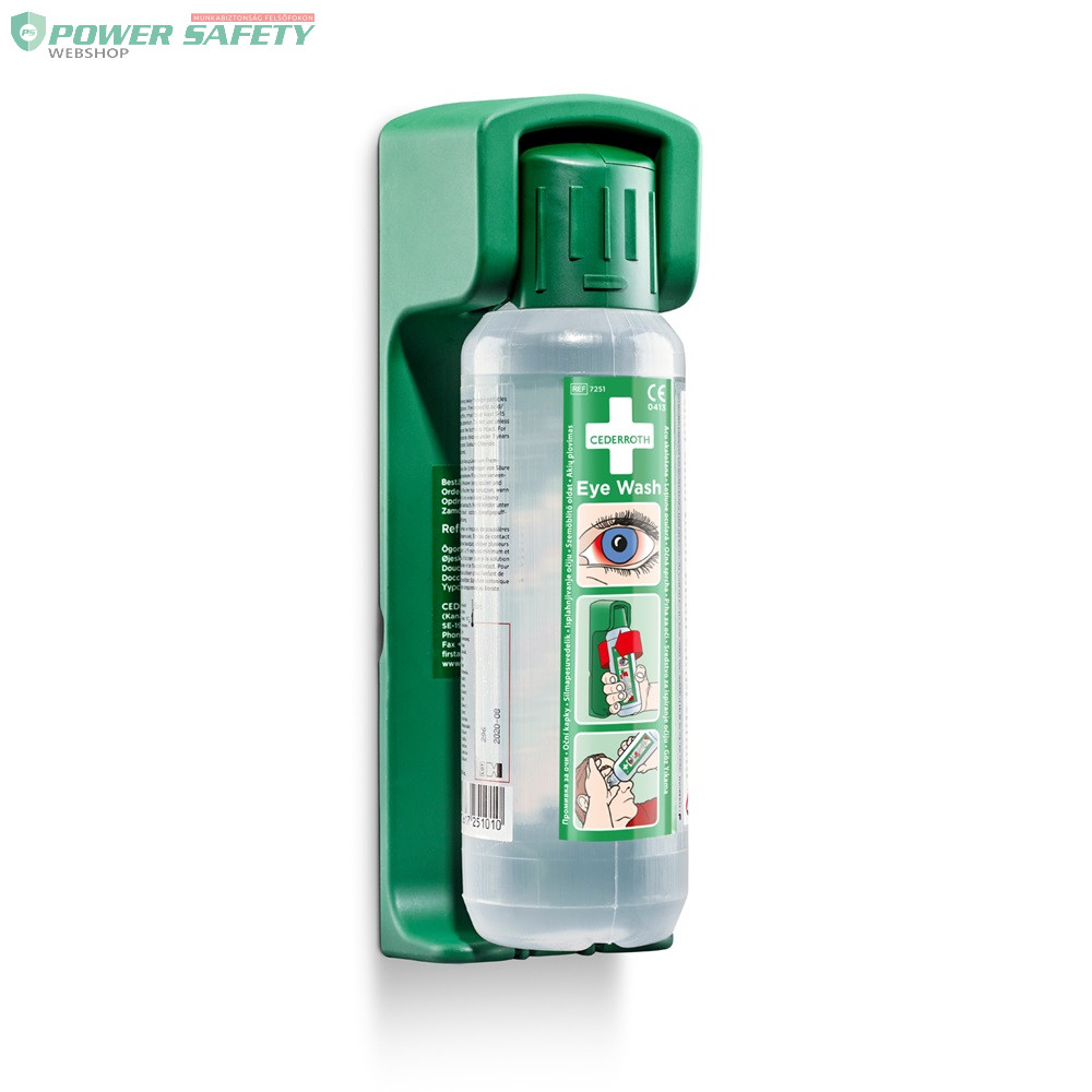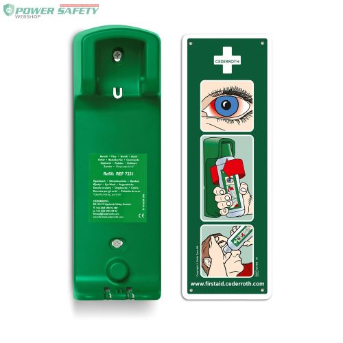 Kemény, zöld műanyagból készült robusztus és praktikus fali tartó Cederroth szemkimosó palakhoz. A fali tartó fix helyet biztosít a flakon számára, így vészhelyzetben könnyen megtalálható. A palack automatikusan kinyílik a tartóból való kicsavaráskor, lehetővé téve az azonnali öblítést. A tartó bármilyen függőleges felületre felszerelhető, pl. falra, járműre, laboratóriumi asztalra vagy akár a Cederroth elsősegélynyújtó táblára is. Fluoreszkáló használati utasítás táblával ellátva.