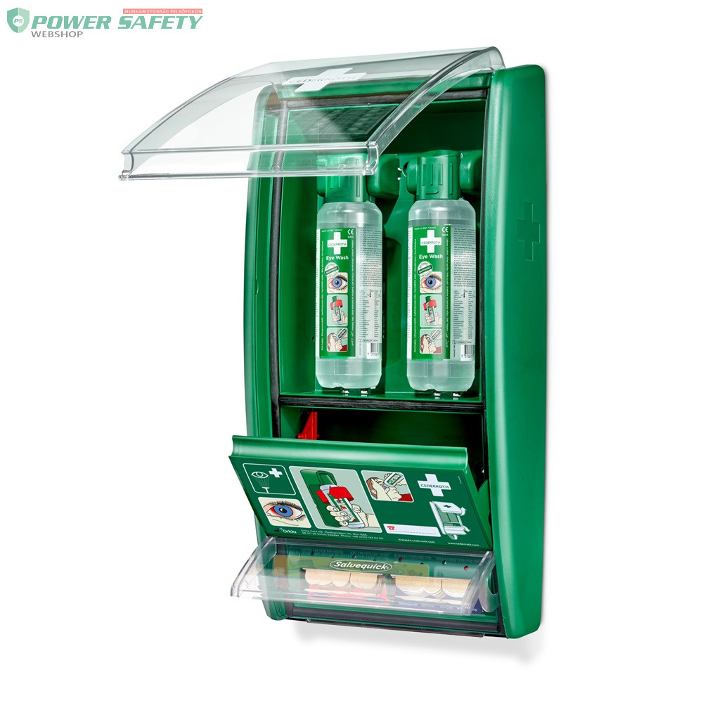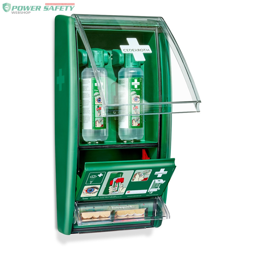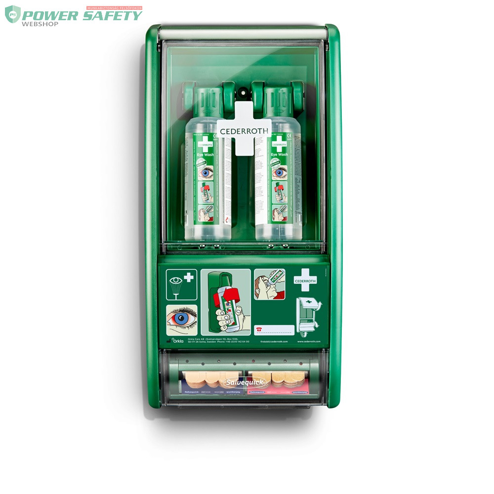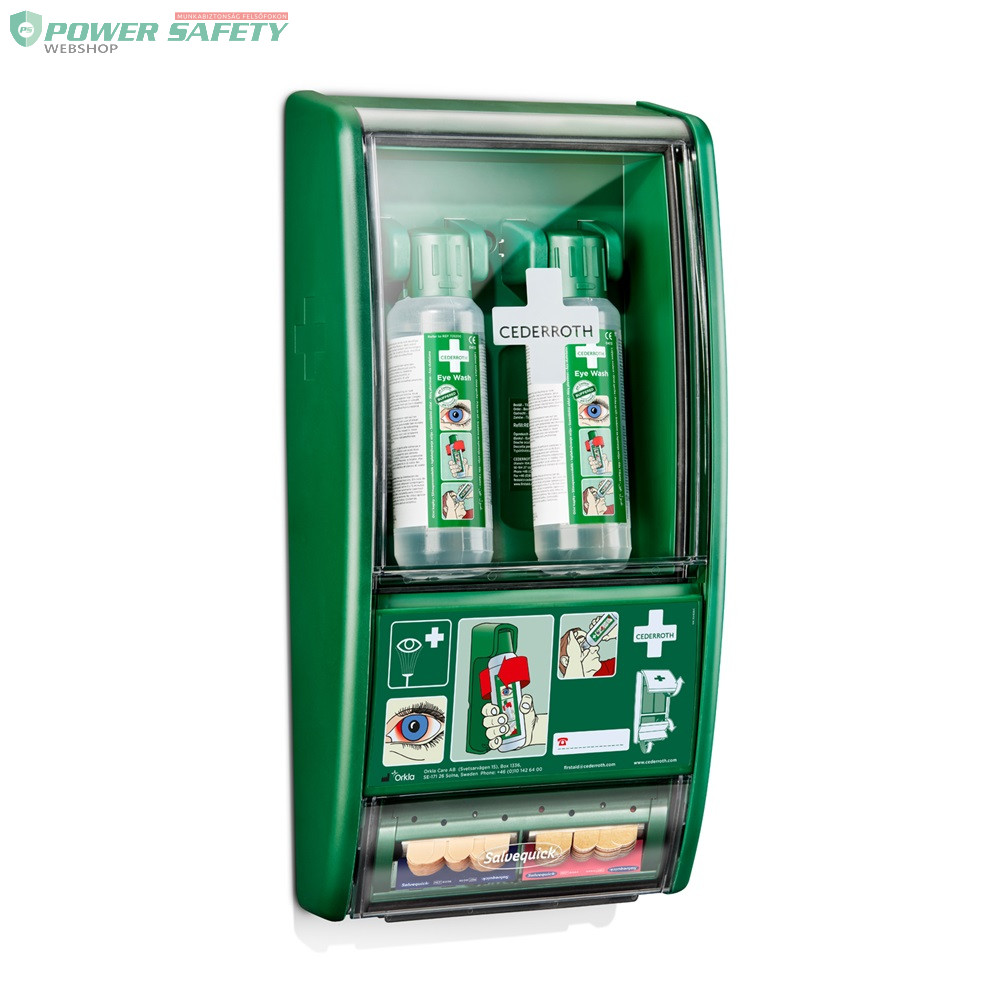 Sebtapaszokkal kiegészített komplex szemkimosó állomás, két flakon Cederroth szemkimosóval, valamint műanyag és textil sebtapaszokkal a biztos elsősegélynyújtásért. Az átlátszó fedél védi a palackokat és a sebtapaszokat a portól, szennyeződésektől, víztől, és segíti a könnyű áttekinthetőséget. A palackok automatikusan kinyílnak a tartóból való kicsavaráskor, lehetővé téve az azonnali öblítést. A sebtapaszok a könnyű hozzáférés érdekében külön adagolókban vannak elhelyezve, és a speciális utántöltő kulcsnak köszönhetően lopásbiztosan tárolhatóak. Az elsősegélynyújtási utasításokkal ellátott fedél mögött további termékek számára is biztosított a hely. A termékek orvostechnikai eszközök, CE-jelöléssel rendelkeznek.
