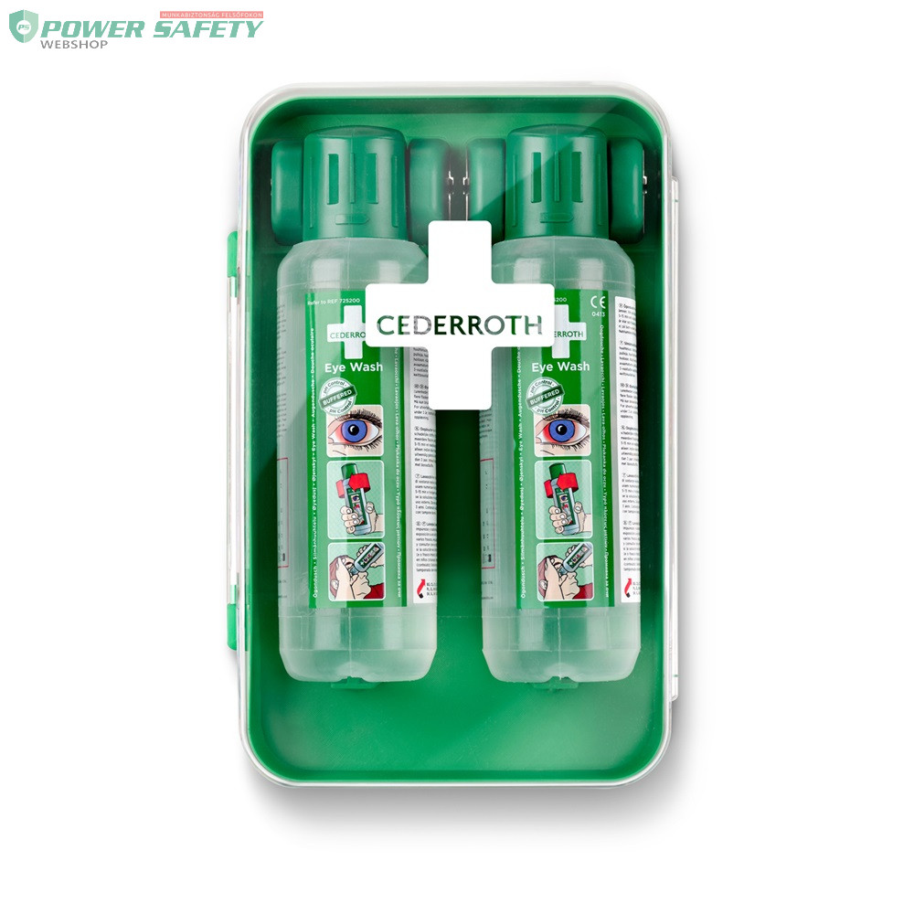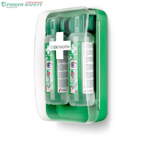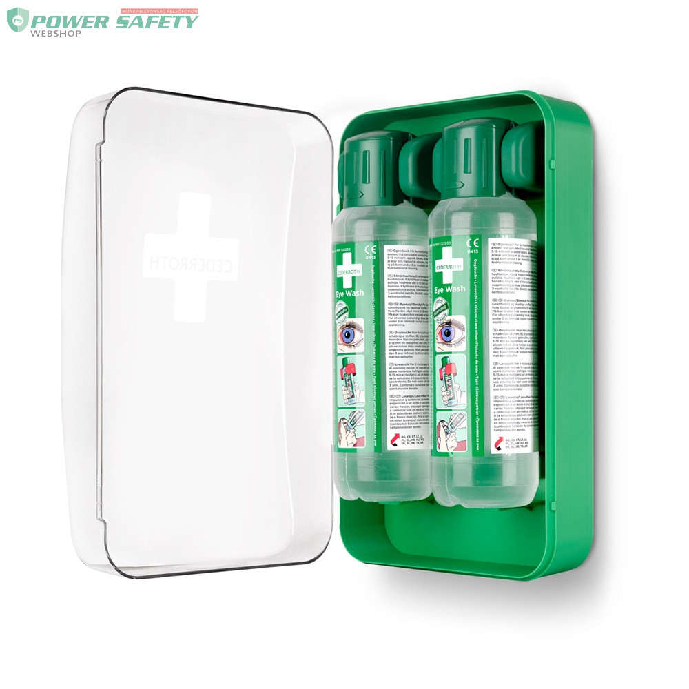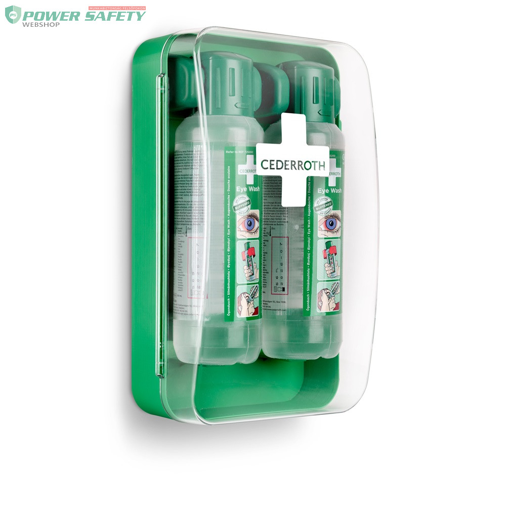 Kompakt, por- és vízálló szemkimosó állomás két flakon Cederroth borátos szemkimosóval. Könnyen elfér még kis helyen is. Az átlátszó fedél védi a palackokat a portól, szennyeződésektől, víztől, és segíti a könnyű áttekinthetőséget. A palackok automatikusan kinyílnak a tartóból való kicsavaráskor, lehetővé téve az azonnali öblítést. A szekrény bármilyen függőleges felületre felszerelhető, pl. falra, járműre vagy akár laboratóriumi asztalra. A szemkimosó palackok orvostechnikai eszközök, CE-jelöléssel rendelkeznek. Fluoreszkáló használati utasítás táblával. A zöld színű műanyag >64%-ban újrahasznosított műanyagból készült. Tökéletes poros és piszkos munkahelyekre, ahol kiemelt a kockázatot jelent a szembaleset veszélye, vagy korlátozott hely esetén.