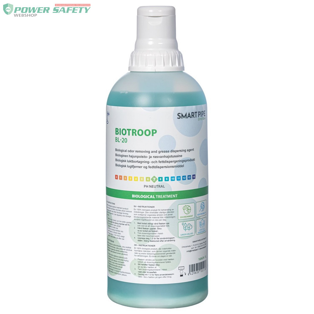 Környezetbarát és biztonságos használatra kész csővezeték-kezelő szer professzionális használatra. A BioTroop BL-20 olyan mikrobákat tartalmaz, amelyek a csővezetékekben lévő szerves lerakódásokat használnak tápanyagként. Feloldja a szerves hulladékot, mint például fehérjéket, cukrot, keményítőt, zsírt, olajat, cellulózt, valamint a nyers szennyvizet. A termék enyhe illatanyaggal rendelkezik, amely megszünteti a kellemetlen szagokat. A folyamat során kitisztítja a lefolyókat és megszünteti a rossz szagokat, melyek szagtalanok maradnak. 100%-ban biológiailag lebomló és környezetbarát, szennyvíztisztító telepekkel is kompatibilis.