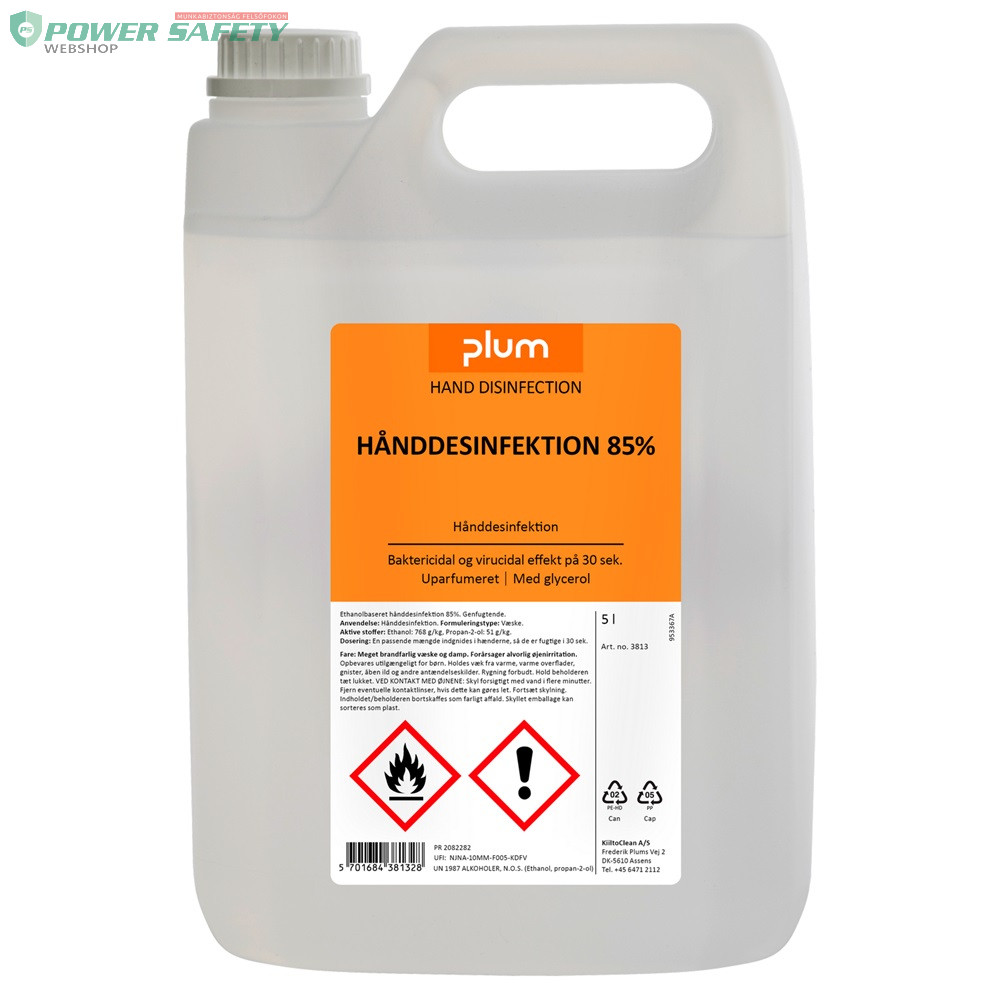 85% etanol alapú, 6% IPA tartalmú fertőtlenítő folyadék. Baktericid, yeasticid, szelektív virucid (norovirus, koronavirus) hatású kézfertőtlenítő folyadék, mely megbízható védelmet nyújt a fertőzésekkel szemben. Ápolja, nem engedi a bőrt kiszáradni. A termék megfelel az európai szabványoknak (EN12054, EN1500). Bőrgyógyászatilag tesztelt. Használatát ajánljuk az egészségügy, élelmiszeripar és a vendéglátóipar területén is. Megbízhatóan fertőtlenít víz és szappan nélkül is. Kézfertőtlenítő automata adagolórendszerek utántöltéséhez is alkalmazható.Biocidok alkalmazásakor ügyeljen a biztonságra! Használat előtt mindig olvassa el a címkét és a használati útmutatót!Biocid hatóanyag: etil-alkohol (76,77%, CAS: 64-17-5), izopropil-alkohol (5,09%, CAS: 67-63-0)Egyéb összetevők: glicerin, vízVeszélyes összetevők: etil-alkohol, izopropil-alkoholAntimikrobális spektrum: baktericid, yeasticid, szelektív virucid (adenovírus, norovírus, burkos vírus inaktiváló hatása)Terméktípus: PT1Alkalmazási terület: Higiénés kézfertőtlenítésFormuláció: felhasználásra kész folyadékFelhasználói kör: lakossági és foglalkozásszerűAlkalmazási koncentrációk, behatási idő:A terméket hígítatlanul kell alkalmazni. Kb. 4-5 ml készítményt juttatunk a tenyérbe, melyet a kezeken 30 másodpercig alaposan eldörzsölünk, majd hagyjuk elpárologni.Figyelmeztetés Más tisztító-, és fertőtlenítőszerrel keverni tilos! Csak ép bőrfelületen alkalmazható! Nyálkahártyákon nem alkalmazható! Nyílt láng közelében alkalmazni tilos! Elektromos eszközhöz csak teljesen megszáradt kézzel szabad hozzányúlni!VeszélyH225                    Fokozottan tűzveszélyes folyadék és gőzH319                    Súlyos szemirritációt okozP101                     Orvosi tanácsadás esetén tartsa kéznél a termék edényét vagy címkéjétP102                     Gyermekektől elzárva tartandóP210                     Hőtől, forró felületektől, szikrától, nyílt lángtól és más gyújtóforrástól távol tartandó. Tilos a dohányzás.P233                     Az edény szorosan lezárva tartandó.P305 + P351 +    SZEMBE KERÜLÉS esetén: Több percig tartó óvatos öblítés vízzel. Adott esetben a kontaktlencsékP338                    eltávolítása, ha könnyen megoldható. Az öblítés folytatása.P337 + P313        Ha a szemirritáció nem múlik el: orvosi ellátást kell kérni.P501                     A tartalom/edény elhelyezése hulladékként: a 225/2015. (VIII.7.) Korm. rendeletnek, valamint a 72/2013. (VIII.27.) VM rendeletnek megfelelően.Elsősegélynyújtás:Belégzés:             A sérültet vigyük friss levegőre. Helyezzük nyugalomba és óvjuk a lehűléstől. Rosszullét esetén forduljunk orvoshoz.Bőr:                      Ha a termék sebbe kerül, mossuk le vízzel. Tartós irritáció kialakulása esetén orvoshoz kell fordulni.Szem:                   A szembe került anyagot azonnal öblítsük ki alaposan langyos folyóvízzel a szemhéjak széthúzása mellett. Ha van, a kontaktlencsét távolítsuk el, majd folytassuk az öblítést legalább 10-15 percig. Forduljunk szemorvoshoz.Lenyelés:             A szájat alaposan ki kell öblíteni. Hánytatni tilos! Itassunk kis kortyokban 1-2 pohár vizet a sérülttel. Forduljunk orvoshoz.Hulladékkezelés: A termékhulladék, ill. elhasznált termék a veszélyes hulladék kategóriába tartozik. Kezelésére a 225/2015.(VII.7.) Korm. rendeletben, valamint a 72/2013. (VIII. 27.) VM rendeletben, ill. az EU szabályozásában foglaltak az irányadók.Környezetvédelem/ökotoxikológia: Tilos a készítményt, annak fel nem használt maradékát, csomagolóburkolatát élővízbe, talajba, lefolyóba, illetve a terméket hígítás nélkül közcsatornába juttatni. Nagy mennyiség kiömlése esetén értesíteni kell az illetékes hatóságokat.Szennyezés-mentesítés: A kiömlött terméket ártalmatlanítás céljából gyűjtsük össze neméghető folyadékfelszívó anyaggal (homok, kovaföld, savmegkötő, univerzális folyadék megkötő) és helyezzük megfelelő tároló edényzetbe. Veszélyes hulladékként kezelendő. A szennyezett terület nagymennyiségű vízzel takarítható fel.Tárolás, eltarthatóság: Az eredeti, zárt göngyölegben, napfénytől, sugárzó hőtől, gyújtóforrástól védve, erős oxidáló anyagoktól elkülönítve, hűvös helyen tárolandó.Tárolási hőmérséklet: 0-30°C között.Előírt tárolás mellett a gyártástól számított 36 hónapig eltartható.Gyártási idő/Lejárati idő: lásd az első címkén.Kiszerelési egység: Lásd a csomagolásonGyártja: Kiiltoclean A/S, Hagalokkveien 13; Postboks 103, 1371, Asker, NorgeForgalomba hozza: Plum Magyarország Kft., 8200 Veszprém, Erdész utca 4., Tel: 06-20/933-2000NNK engedély száma: 46795-3/2020/JIF