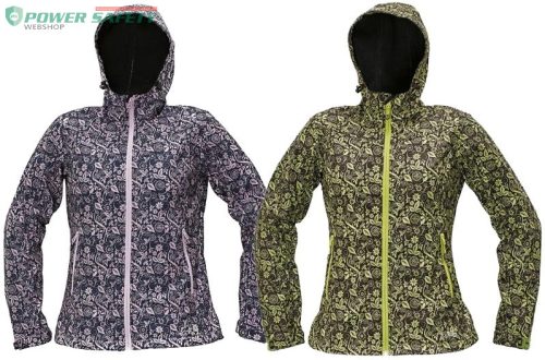 Női softshell kapucnis dzseki mintás anyagból, 3 rétegű: a külső réteg alatt TPU mebránnal és polár béléssel. A kapucnija zsinórral megköthető. Oldalzsebek cipzárral, kettő belső zseb. Az ujjak tépőzárral szűkíthetők. Nagy teljesítmény: vízoszlop 8000mm, lélegzőképesség 5000 mvp