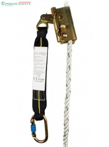 ROP-STOP csúszó zuhanásgátlógátló eszköz csavart kötélen o14mm-től 16mm-ig + hosszabbító heveder + acél karabiner csavaros zárral. Egyszerű és könnyű nyitórendszere lehetővé teszi a készülék felszerelését és leszerelését a kötél bármely részében, automatikus biztonsági rendszerrel.